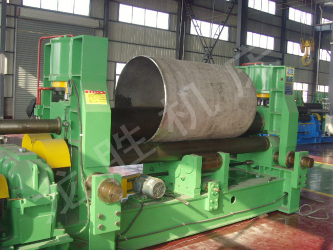 该机属于液压型三辊卷板机,用于常温状态下将各种容器用碳钢、低合金钢一次上料后不需调头即完成板材端部预弯、卷圆和矫圆等工序。 上辊可以垂直移动、水平移动。 预弯通过上辊水平移动,使上辊相对于下辊呈非对称位置来实现。