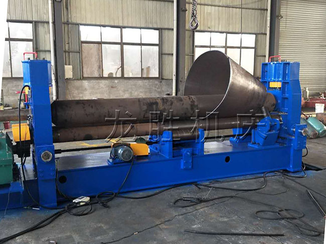 该机属于液压型三辊卷板机,用于常温状态下将各种容器用碳钢、低合金钢一次上料后不需调头即完成板材端部预弯、卷圆和矫圆等工序。 上辊可以垂直移动、水平移动。 预弯通过上辊水平移动,使上辊相对于下辊呈非对称位置来实现。